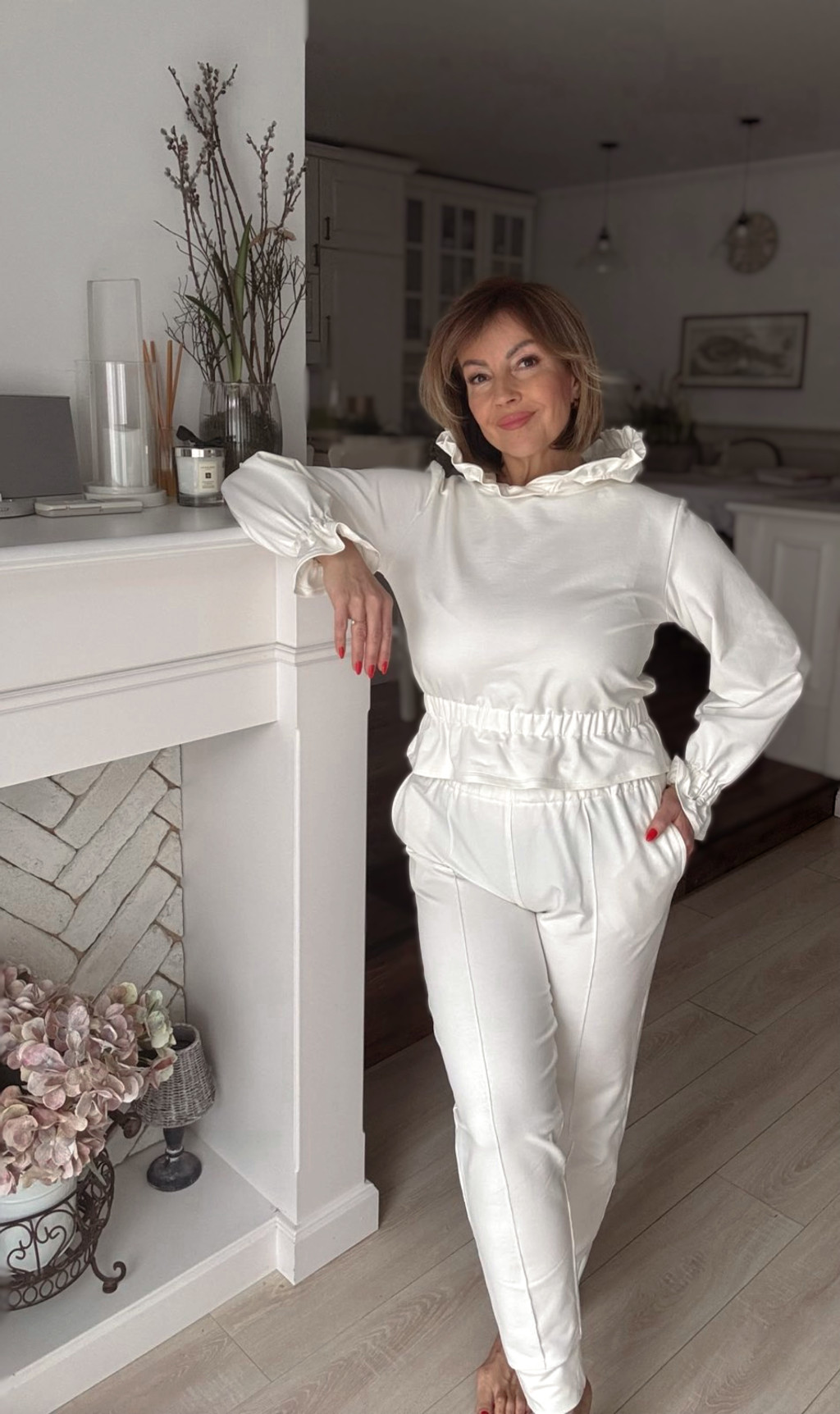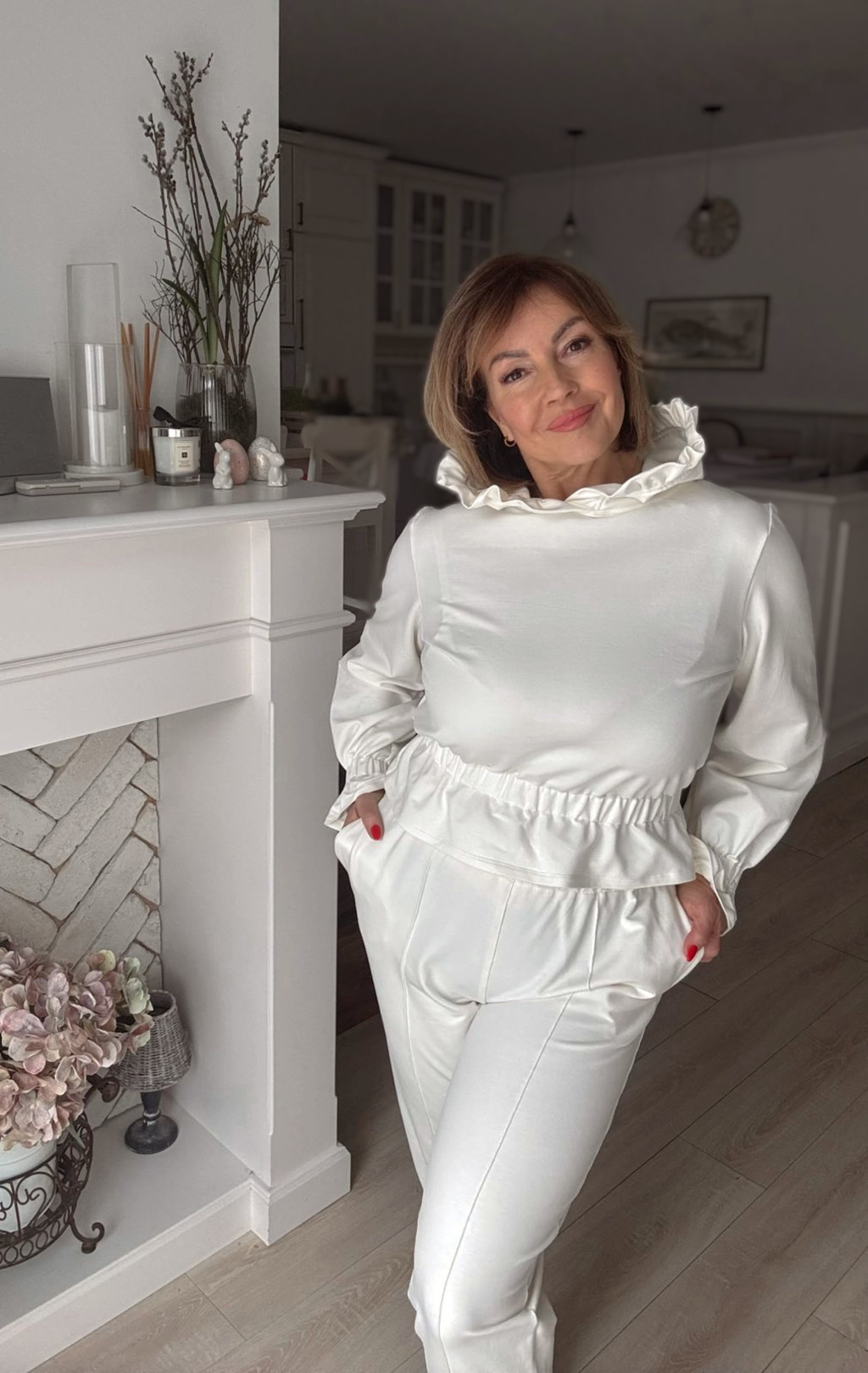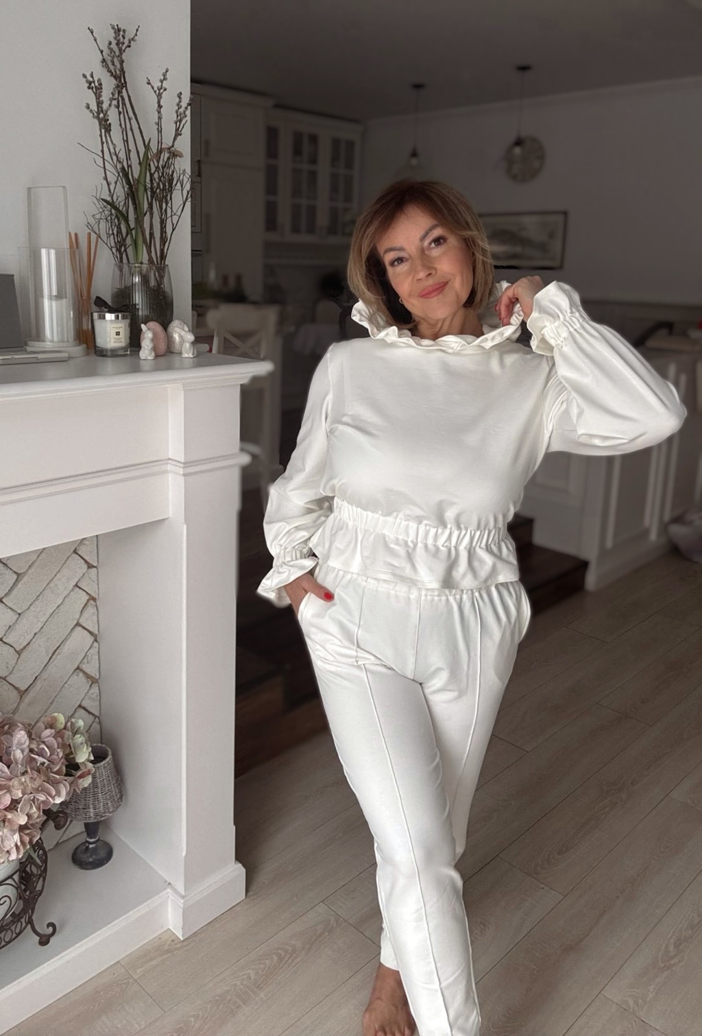Nagyon kényelmes, ám különlegesen szép viselet is, mivel a fodros kapucni, a húzott peplumos derékrész és a csodaszép élvarrott nadrág nem hétköznapi megjelenést kölcsönöz viselőjének.