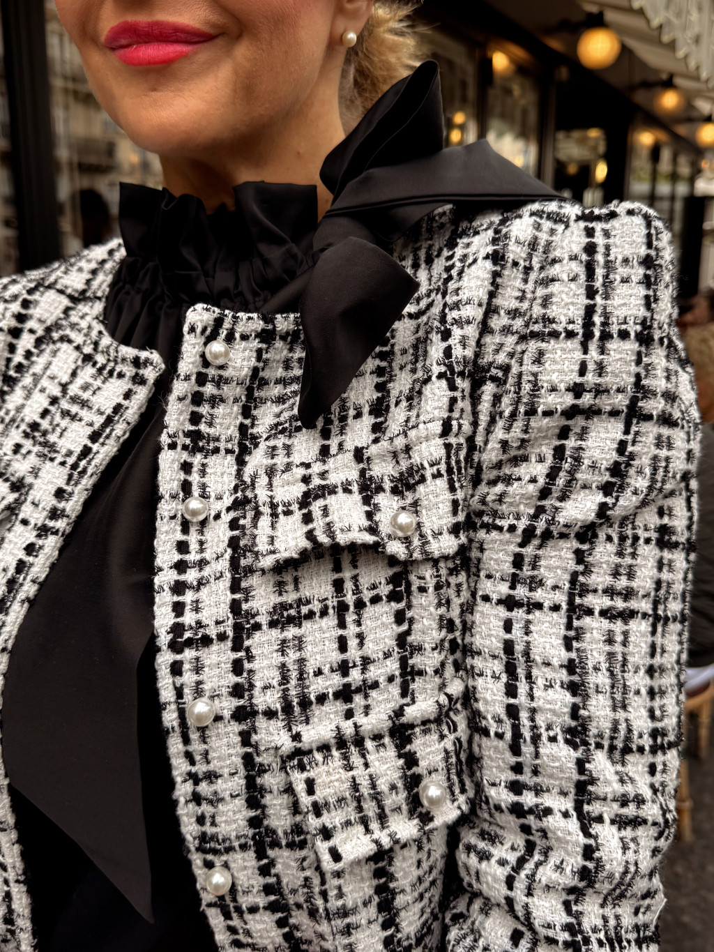 Nőies, elegáns és letisztult...így lehetne jellemezni ezt a rendkívül csinos darabot. A buklé alapanyagból készült zakónkat a kifinomultság jellemzi, ehhez hozzájárul az enyhén húzott vállrész, a 4 db diszkrét zseb és a gyöngygombok.
