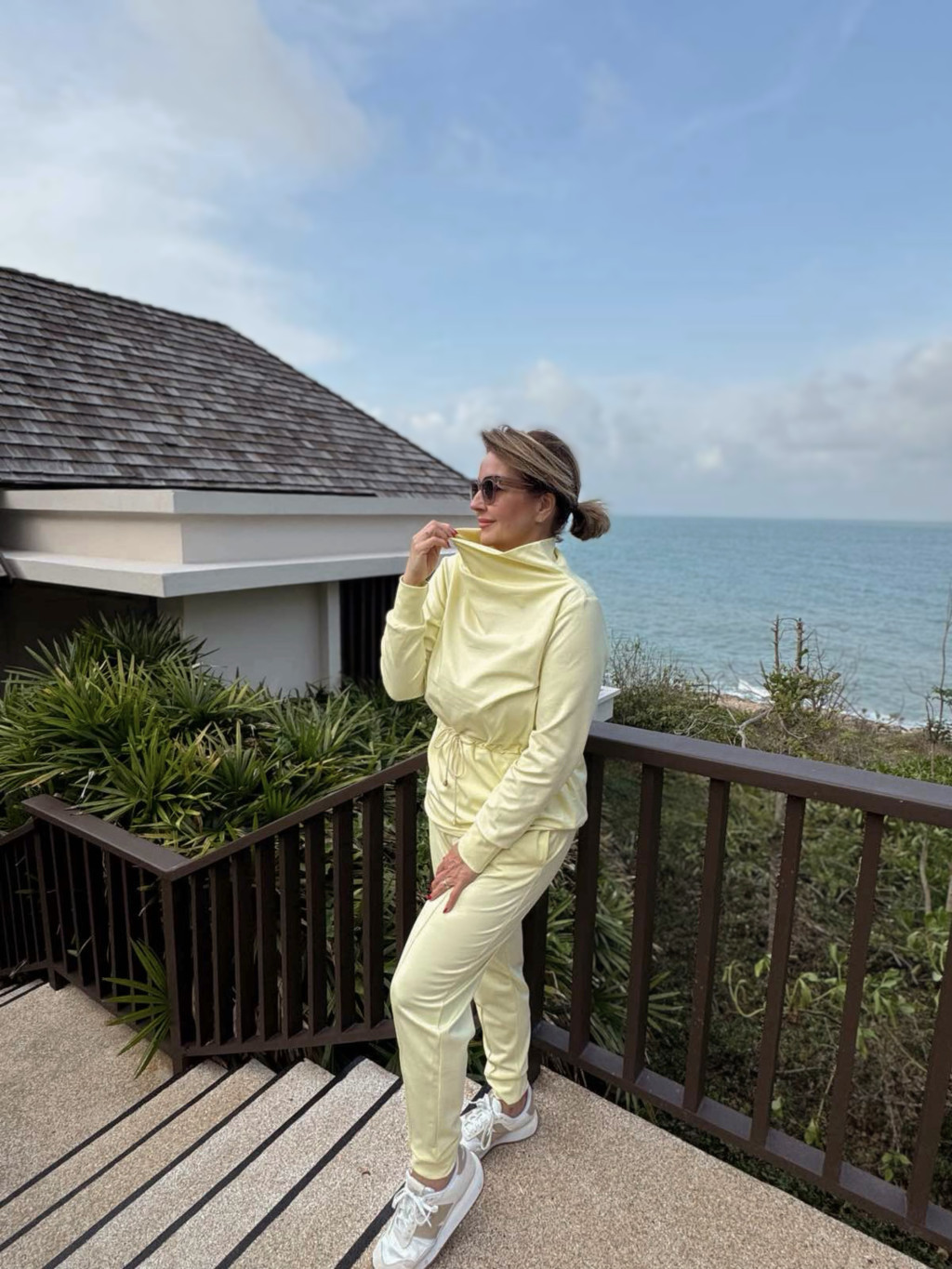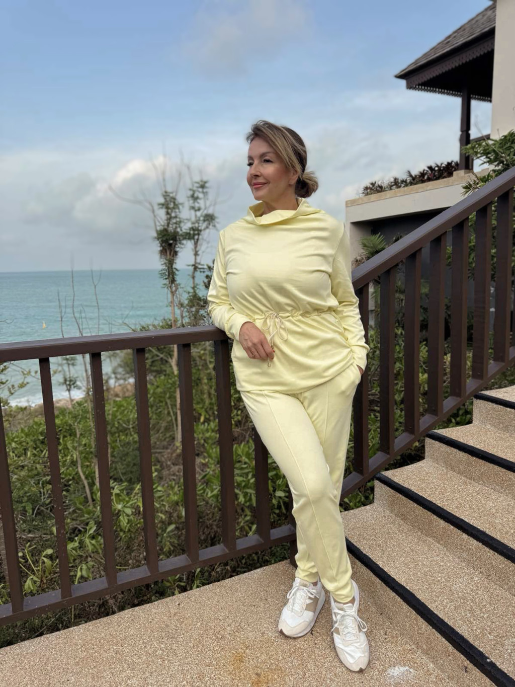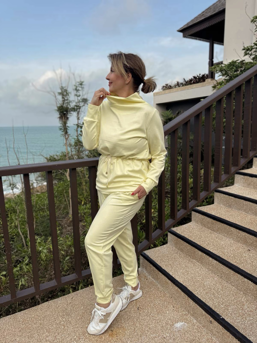 Nagyon kényelmes, ám különlegesen szép viselet is, mivel a kámzsás nyakú pulóver, a húzott derékrész, a csodaszép nadrág és a prémium alapanyag nem hétköznapi megjelenést kölcsönöz viselőjének.