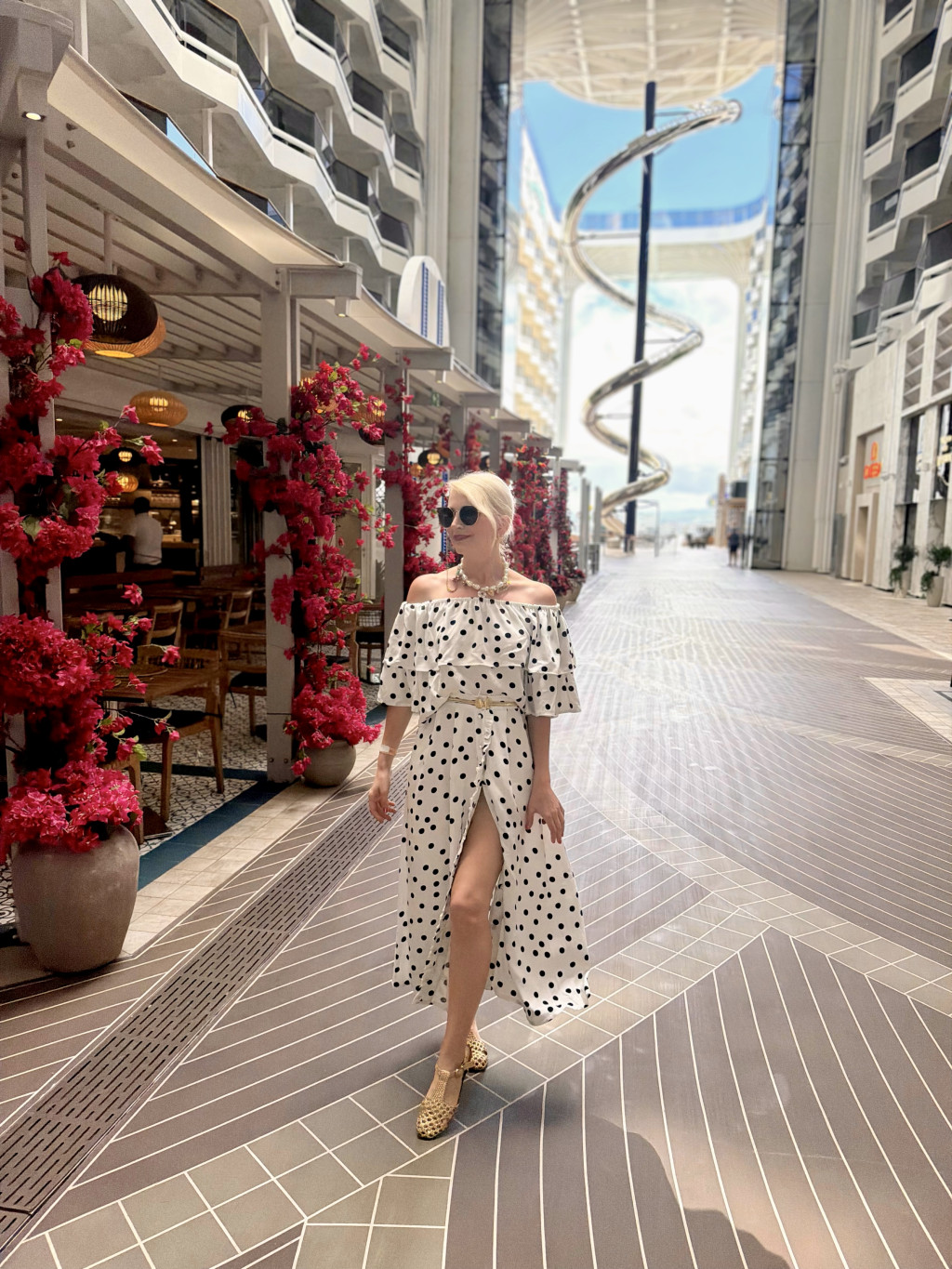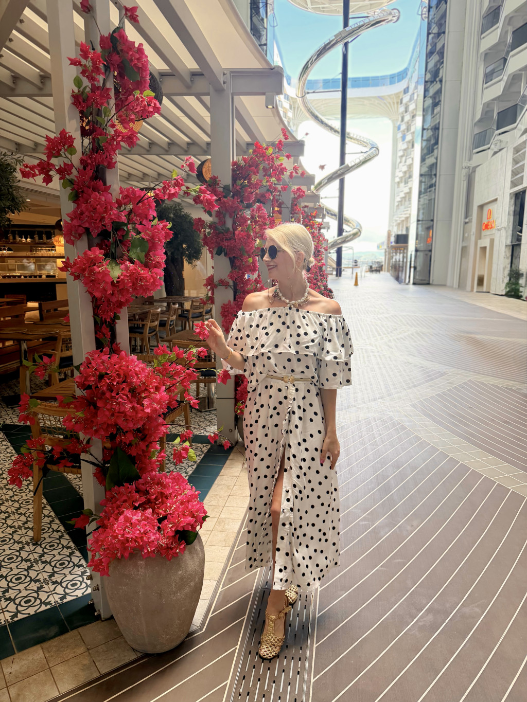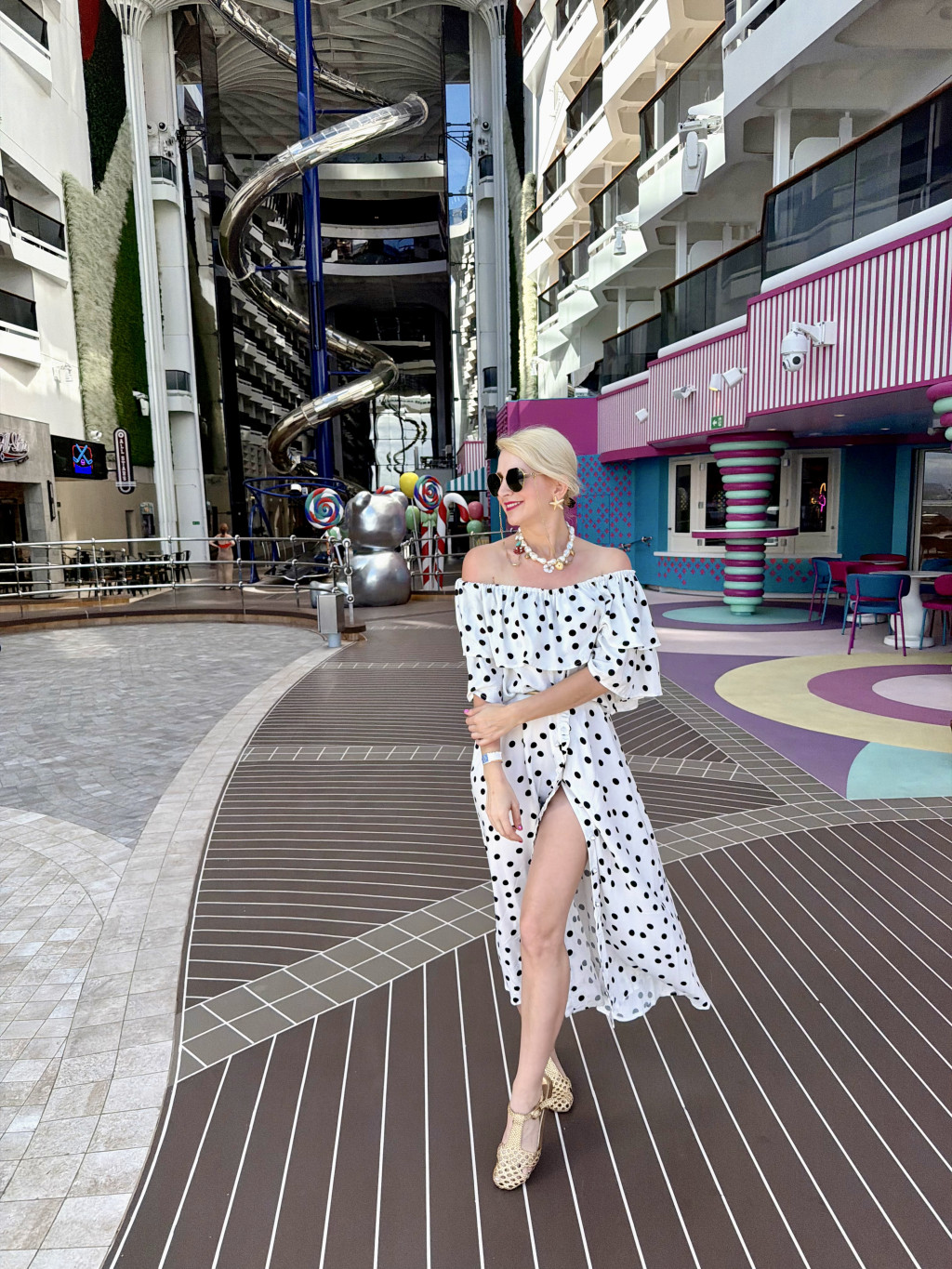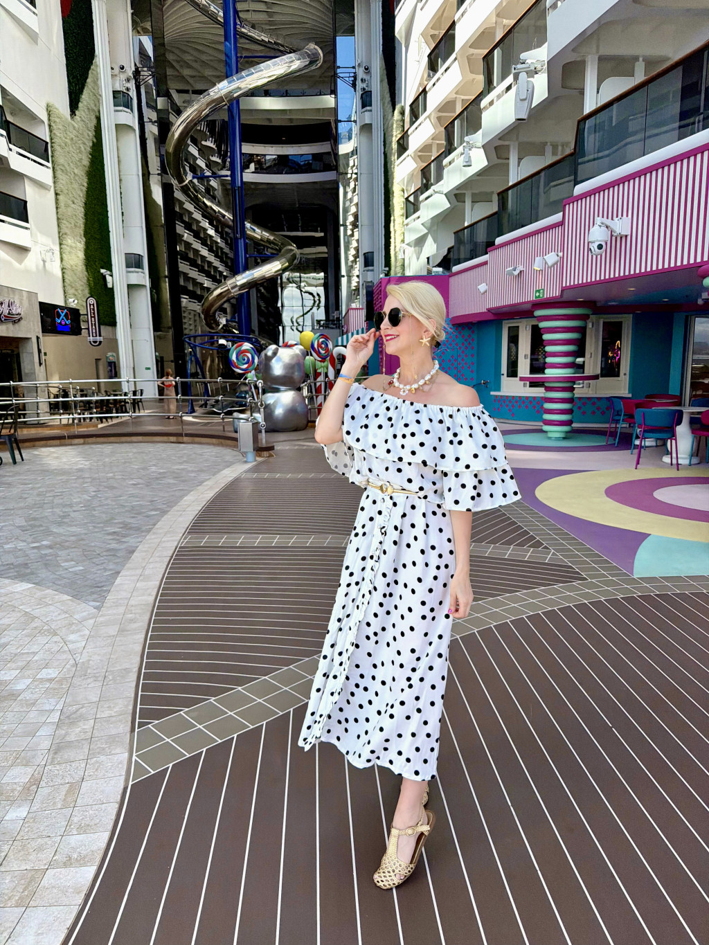Elöl gyöngy gombokkal díszített elegáns pöttyös anyagból készült, különlegesen szép szoknya.