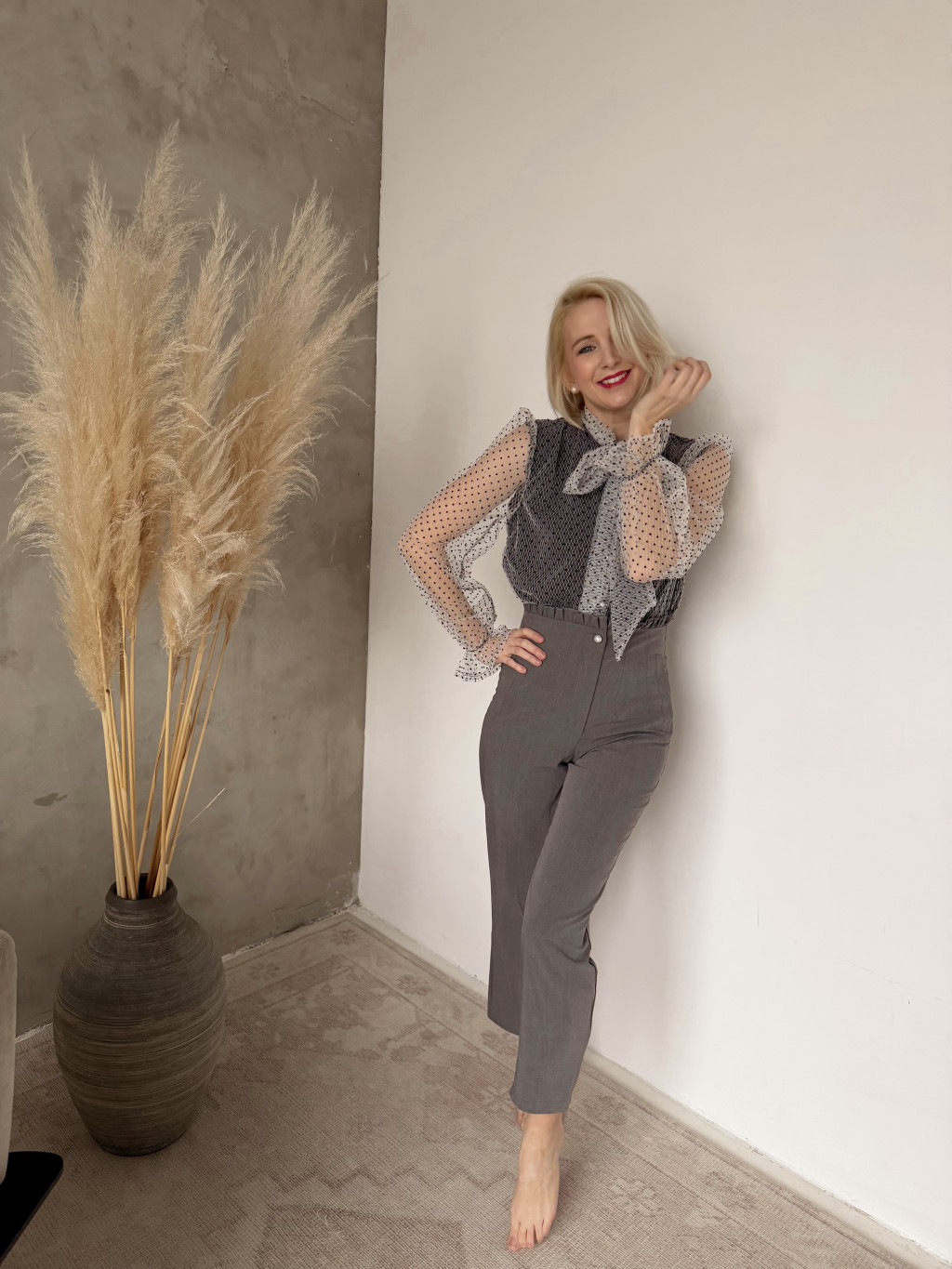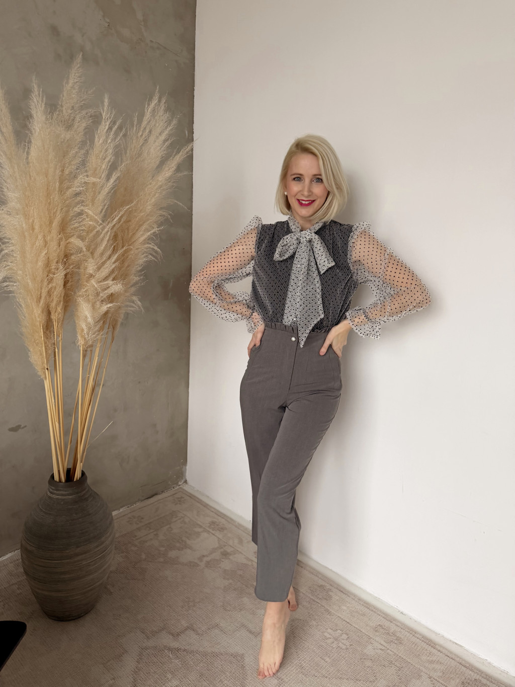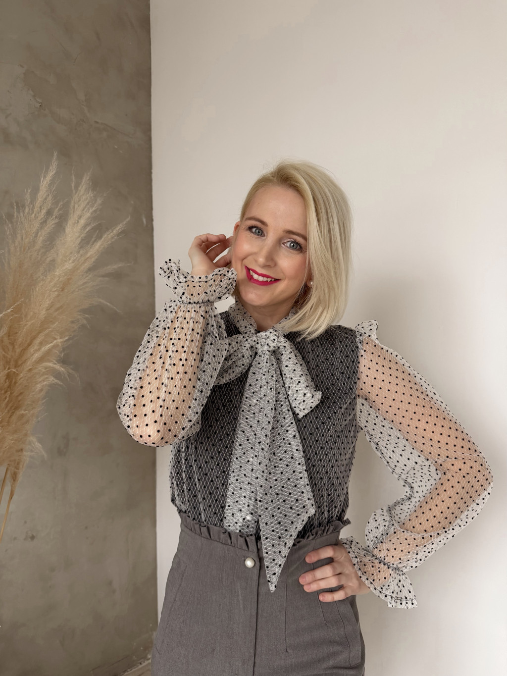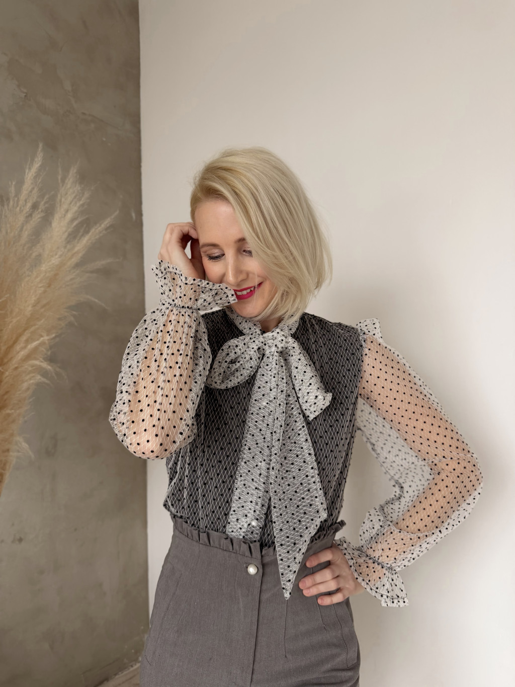 Igazán nőies, sálgalléros, masnira köthető, fehér alapon fekete pöttyös blúzunk a kifinomult francia elegancia megtestesítője.