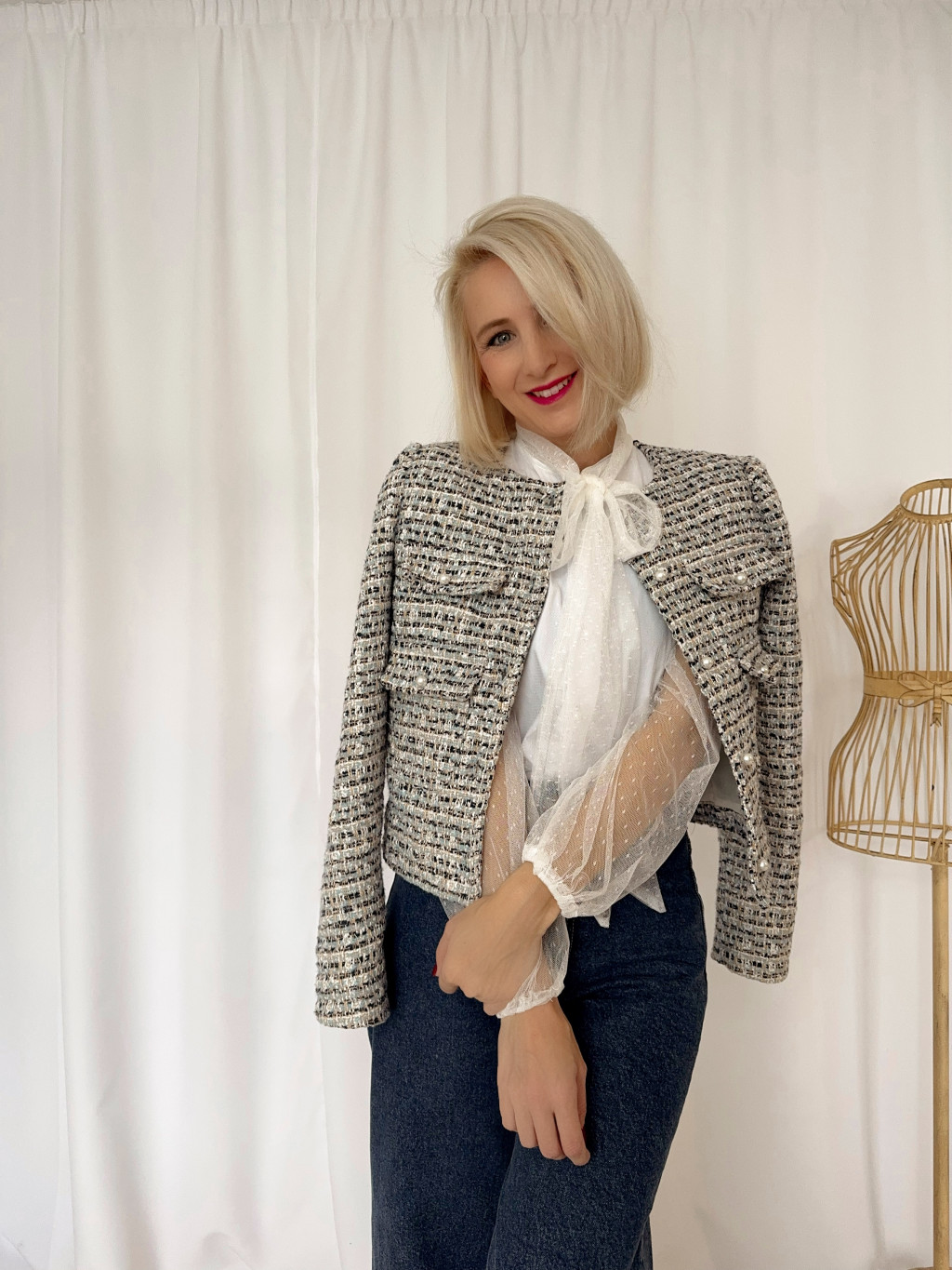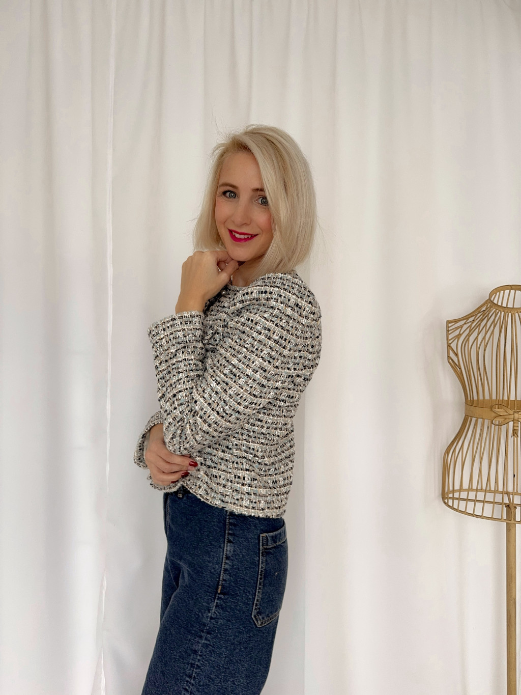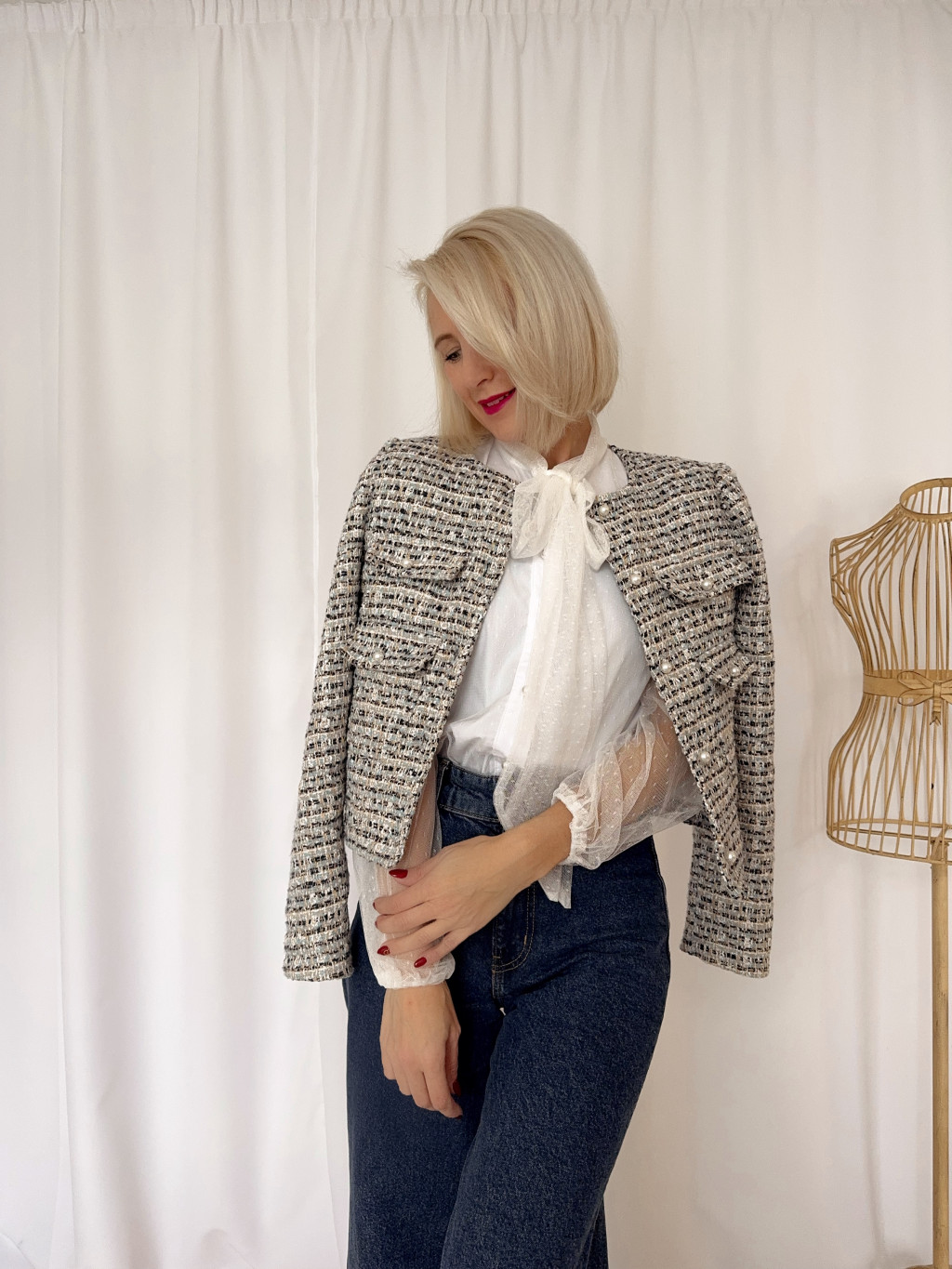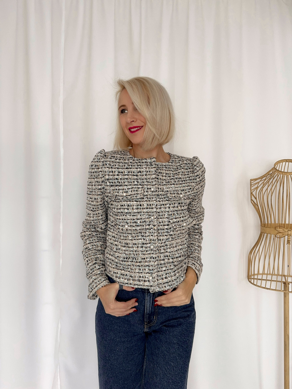 Tipikus francia kis buklé blézer. Csinos, kékes árnyalatú buklé anyagból, gyöngygombokkal a zsebfedőn.